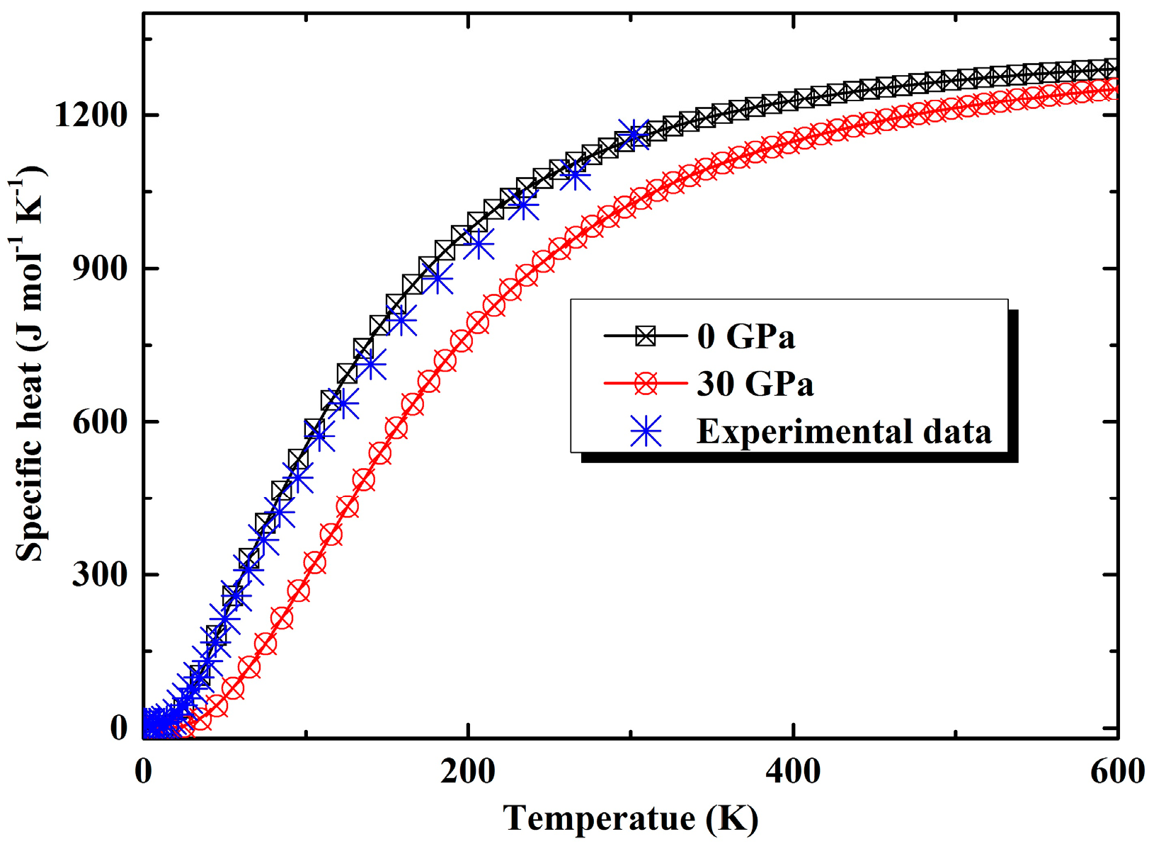 Because the experimental specific heat was conducted at constant pressure namely Cp, in Figure 6, the resulting dependence of Cp on temperature calculated from QHA method at zero pressure is illustrated, the experimental data up to room temperature from Stefanoski have also been plotted together for a comparison [46]. It can be found that they agree with each other excellently (for instance, the specific heat at room temperature determined by present work is 1151.5 J·mol−1·K−1, experimental measured value is 1159.6 J·mol−1·K−1) which indicates the validity of present lattice dynamic simulation within DFTP. At low temperatures, the temperature dependence of specific heat presents a similar behavior to thermal expansion coefficient. When the temperature is higher than about 400 K, specific heat gradually approaches the Dulong-Petit limit, i.e., 3nNAkB (about 1397.2 J·mol−1·K−1) which is followed by all solid at high temperatures. In our former study [47], we found the specific heat of Na8Si46 predicted by quasi-harmonic Debye model was underestimated obviously at low temperature which revealed the limitation of the Debye model in dealing with these doped clathrate compounds. The experimental heat capacities of Na8Si46 were finally reproduced by treating the special “rattle” modes of captured Na atoms in cages as Einstein oscillators. In the present work, a full phonon calculation within DFPT method can give a rather exact description of vibrational properties of these clathrate compounds which avoids a discriminatory treatment of the host lattice and encapsulated atoms. The specific heat of K8Si46 under pressure of 30 GPa is also presented in Figure 6, from which it can be found that pressure can decrease the specific heat considerably due to the suppression of lattice vibration.