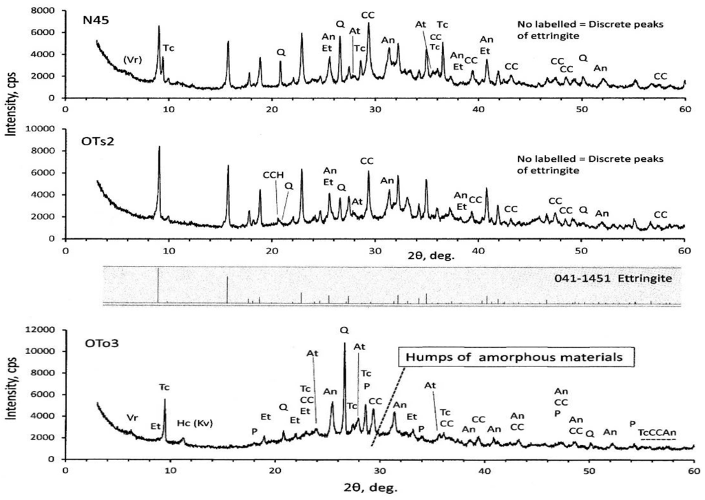 XRD diagrams of the PS-ash are represented in Figure 3. Calcite, quartz, and anhydrite were identified, irrespective of the PS-ash. In addition, humps are recognized around 2θ = 20°–40°. Particularly, the humps are very clear in OTo3, suggesting the presence of amorphous materials. OTo3 is characterized by less presence of ettringite, while the others (OTs2 and N45) show the pronounced presence of ettringite due to high SO3 contents, in addition to high LOI and moisture contents, as seen in Table 1.
