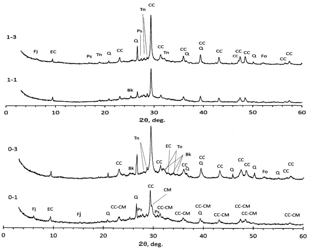 For the plain specimens, XRD diagrams are represented in Figure 5 for the #0 and #1 liquors, respectively. Quartz and calcite remained more or less intact, irrespective of sample species. However, judging from the variation of peak heights, some part of these minerals were reacted and diminished in highly alkaline circumstances, even for quartz. Quartz decrease was also observed in the literature [5]. Ettringite and anhydrite were not detected any more, and neither were anorthite and vermuculite. Instead, the formation of carbonate ettringite was observed, irrespective of specimen species. It is noted that magnesian calcite, (Ca, Mg)CO3, was identified for 0-1 specimen, of which peaks are located just a little bit higher than the 2θ angles of calcite, CaCO3, as shoulders. Peak patterns of magnesian calcite are quite different from dolomite, Ca, Mg(CO3)2. Formation of faujasite, a member of zeolite family, was observed for 0-1 and 1-3 specimens. Other identified minerals are pirssonite, burkeite, and thenerdite, depending on specimens—all formed accompanied with the geopolymerization of mixed alkaline liquors.