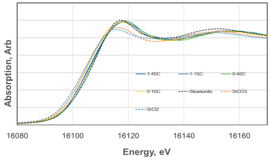 At the moment, no spectral profiles corresponding to SrCO3 were observed in the XANES spectra, even for 1-3SC, which showed highly fluctuating immobilization ratios of Sr2+ with elapsed time, as mentioned. Therefore, we concluded that no depletion of Sr2+ took place in our SC-GP specimens and that the fluctuations may be attributed to the transitional GP-gel structures of C-A-S-H or (C, N)-A-S-H. That is, for instance, differences in degrees of polymerization and/or differences in tetrahedral order–disorder configurations, which would be sensitive to acidic conditions of the leaching test. The XANES technique will become a powerful measure to clarify the bonding and coordination circumstances of matrix gels in geopolymers.