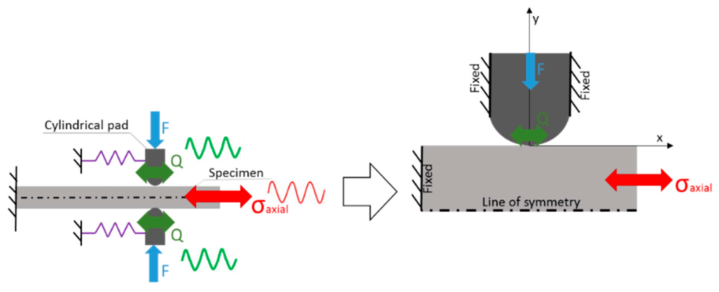 Under fretting conditions, the fatigue limit of a material may be shortened by up to 50% []. It is known that, in this case, the crack growth phase is significantly different from plain fatigue propagation phase, due to the influence of contact stresses distributions on the crack and vice versa []. This contact-crack interaction is particularly important for cracks’ length smaller than the magnitude of the contact zone dimension [] and must be taken into account. For a cylinder-on-plane configuration, the stress and strain field in the specimen can be analytically estimated by a combination of the normal pressure distribution p(x) (due to the normal force, F) and surface traction q(x) (due to the tangential and bulk loads, Q and σaxial, respectively). However, these solutions are valid under a series of conditions, such as infinite and idealized bodies, elastic material properties, and loading conditions, among others. In addition, the stress field near the contact region is variable, multiaxial and non-proportional [], which provides extra complexity to the phenomena.