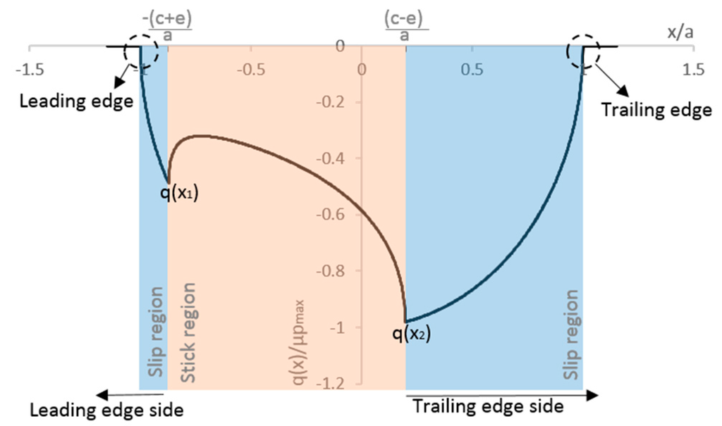 Figure 3 shows a typical normalized shear traction distribution for fretting fatigue specimen using Equation (6). Note that, based on this distribution, it is possible to determine the size of the stick and slip zones and also the peak values of shear stresses. For this paper, we monitored two peak values of shear tractions q(x1) and q(x2), at the leading edge and at trailing edge sides (the edge of the largest slip zone []), respectively.