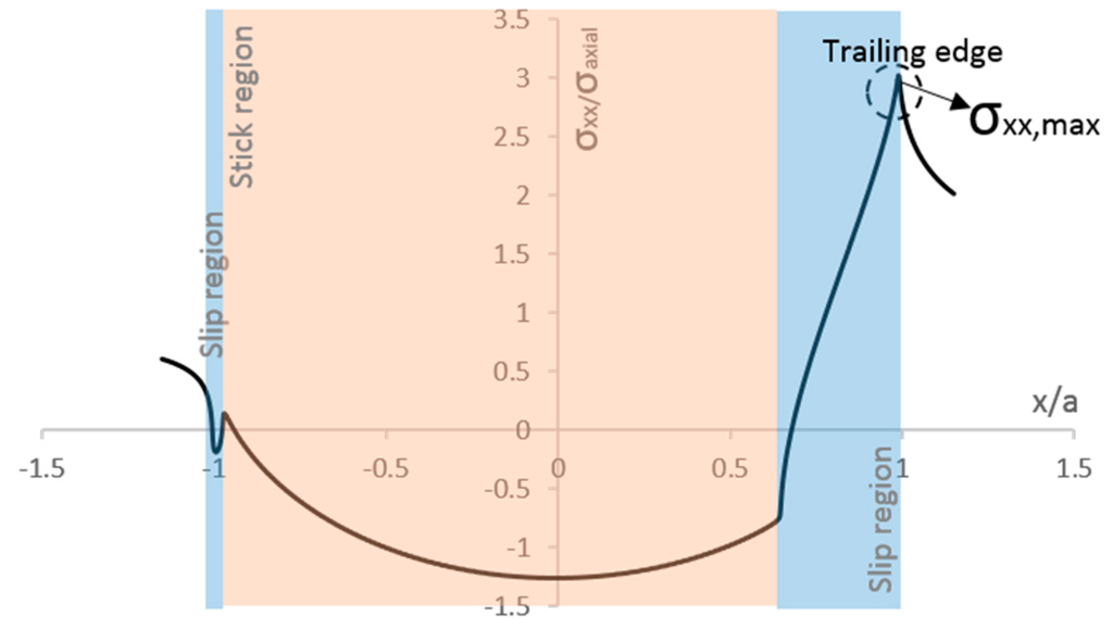 In his literature review, Mutoh [] mentioned studies showing that fretting fatigue cracks, which propagate to material final ruptures, originate in the edge of the contact area (x = a), while small arrested cracks are initiated near the maximum shear traction q(x2). Other research [,,] has also pointed out that the principal crack initiates near the trailing edge (x = a). The reason for that may be related to the contribution of the principal stress σxx in the stress state at the contact interface. As discussed by Szolwinski and Farris [], studies showed that the sharp peak in tangential stresses σxx,max, at trailing edge of the contact region (see Figure 4), might play a significant role on fretting fatigue crack initiation.