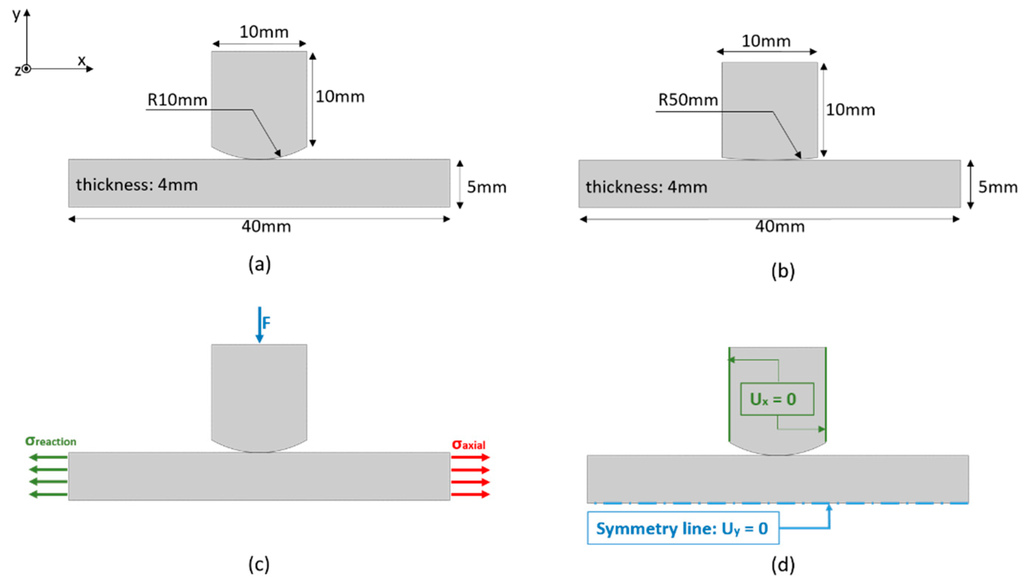 Details of the models: (a) dimensions of FE fretting fatigue model with 10 mm pad radius; (b) dimensions of FE fretting fatigue model with 50 mm pad radius; (c) loading and (d) boundary conditions.