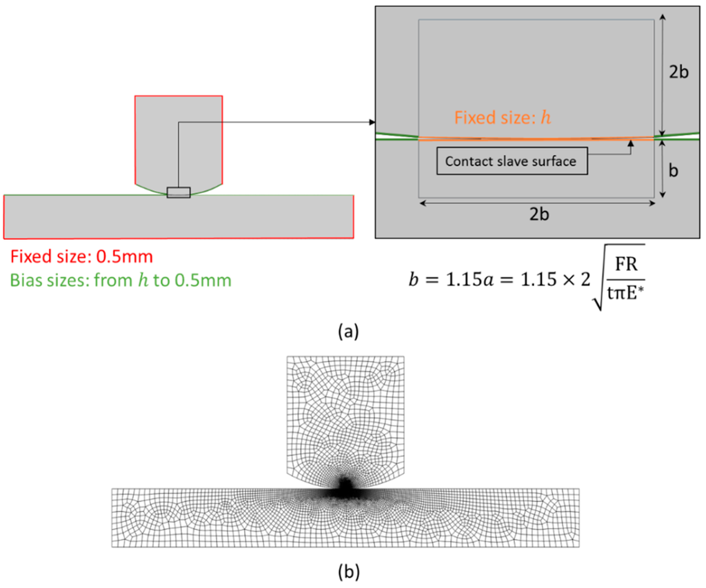 A 2D quadrilateral, 4-node (bilinear), plane strain, reduced integration element (CPE4R) was used in both models. Different mesh sizes were considered at the contact interface and increased as the distance from the contact region increased. In order to create a fine mesh at the contact region, the models were partitioned and the edges were seeded. The values of the mesh element size along the contact region varied according to the following list: 20, 10, 5, 2.5, 1.25, 0.625 and 0.3125 µm. Details of the seeding used to generate the mesh and also of the model partition dimensions are shown in Figure 6. The partition dimensions were dependent on the radius of the pad, being calculated based on the semi-contact width, a, from Equation (4). An illustration of one of the meshes used in this study is also presented in Figure 6.
