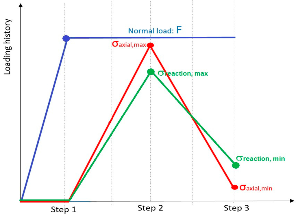 In order to simulate fretting fatigue conditions, the loads are applied in three steps (see Figure 7), with adaptive time steps in ABAQUS®. In the first loading step, the top pad was pressed against the specimen surface by a normal load F = 543 N and this compressed condition was held constant until the end of the cycle. Then, both axial and reaction maximum stresses were applied to the sides of the specimen (values are presented in Table 2). Finally, in the third loading step, both axial and reaction minimum stresses were applied.