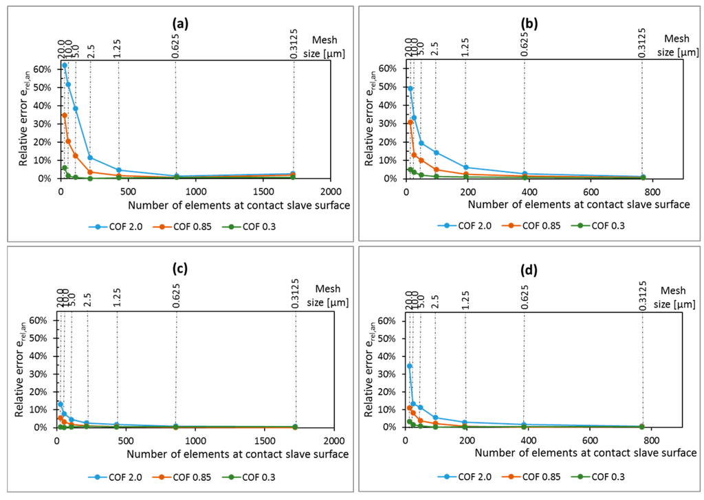 Moreover, it can also be seen that the rate of convergence is dependent on the coefficient of friction for both cases of pad geometry. As different values of coefficient of frictions represent different loading conditions (various sizes of stick zone in comparison with the contact dimension), one might conclude that the rate of convergence of the solution depends on the loading condition. For the smallest coefficient of friction, a relative coarse mesh (around 20 µm) at the contact is sufficient for obtaining reasonable accurate shear stresses at contact, with relative error smaller than 10% for all analyzed cases. However, for higher coefficients of friction, the rate of convergence reduces and it is necessary to use relative fine meshes to guarantee reasonable results. For instance, for coefficient of friction equal to 2.0, a mesh size of 1.25 µm is enough to guarantee that the relative error on the shear traction peak is smaller than 10% for all analyzed cases. However, for the same coefficient of friction and a mesh size of 5 µm, the error can increase to almost 40%, for the contact shear traction peak at leading edge.