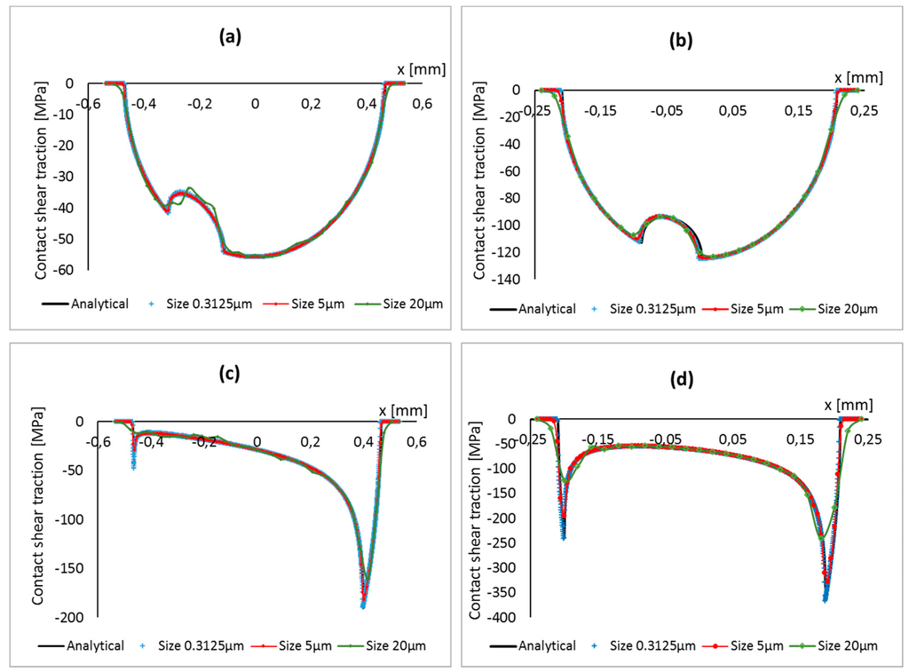 The dependence of the rate of convergence on the coefficient of friction can be further investigated by analyzing the contact shear traction at contact interface. As can be seen in Figure 9, for the case of high coefficient of friction, the contact shear traction distribution has very sharp peaks at both leading and trailing edges, justifying the necessity of a very fine mesh to accurately capture those steep gradients. It is clear that for a higher coefficient of friction, a very fine mesh size is required in order to achieve convergence. This is due to the fact that the value of the friction coefficient affects the contact stress distribution and the larger the coefficient of friction, the steeper the stress gradient. The value of coefficient of friction also affects the stick-slip zone size, which is an important parameter to determine a suitable mesh size as explained in Section 4.2.