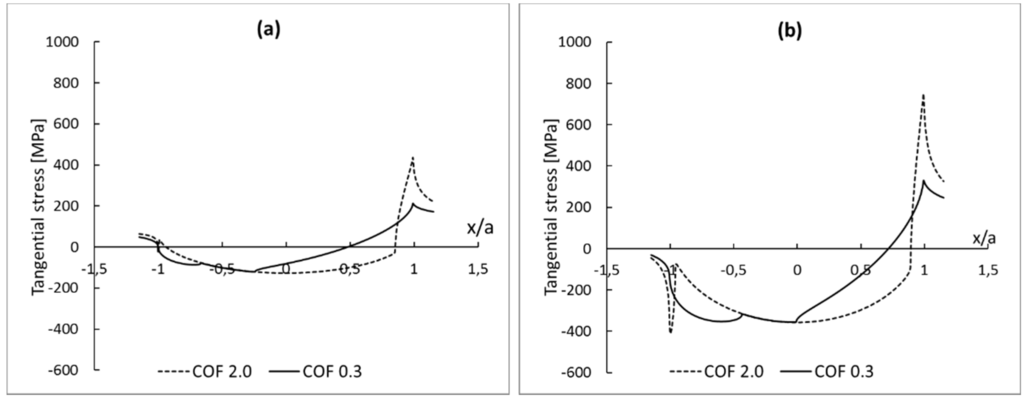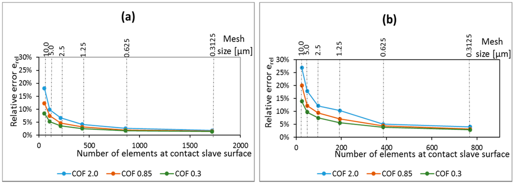Additionally, some comments regarding the convergence rate can be made. For a mesh size of 0.625 µm, the relative error is around 5% for all analyzed scenarios, and results can be considered to be good []. As for the shear traction component, the convergence rate of the maximum tangential stress depends upon the coefficient of friction. Again, for the smallest coefficient of friction, the convergence rate is the highest. This dependency may be further investigated by checking the tangential stress distribution at contact, as shown in Figure 11.