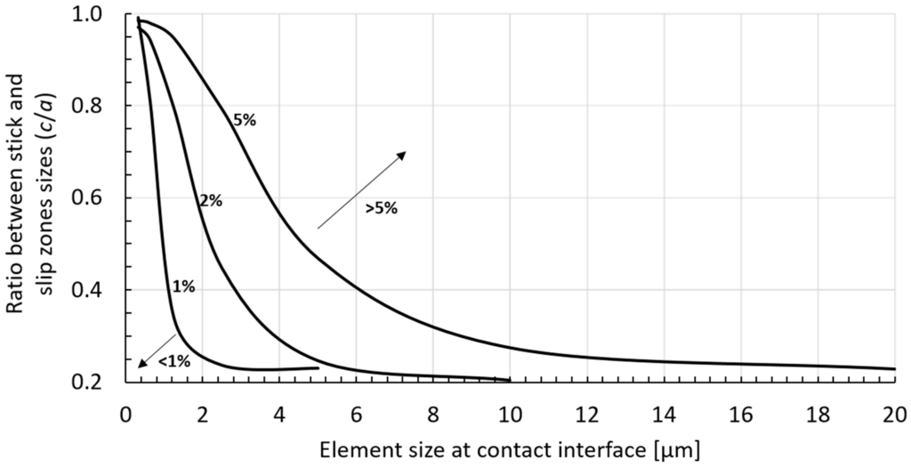 Aiming to help researchers to easily determine the required element size for their finite element analysis for a given stick-slip ratio and desired accuracy, a ‘fretting fatigue convergence map’ was produced and is presented in Figure 12. This map was constructed by plotting the stick–slip ratio (c/a) against the element size in the contact zone for different numerical accuracies (1%, 2% and 5%) and may be used as a reference for choosing the element size in FEA of fretting fatigue (cylinder on plane configuration).