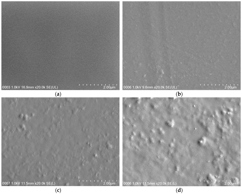 Morphological tests of the films were performed using field emission scanning electron microscopy (FESEM). In general, FESEM gives information about the presence of voids, the homogeneity of the composite, the presence of aggregate, the distribution of the nanoparticles within the continuous matrix, and the possible orientation of nanoparticles [30]. The observations were performed on the surface of PVA/CS film after the synthesis. Figure 1 shows FESEM micrographs of the film surface of PVA/CS = 50/50 films with TOCN content of (a) 0 wt %; (b) 0.5 wt %; (c) 1.0 wt %; and (d) 1.5 wt %. It was observed that incorporation of TOCNs changed the microstructure of the film. The smooth surface of the blend film (Figure 1a) deduced that the homogeneous dispersion of the blend matrix. This is most likely due to formation of hydrogen bonds between the amino and hydroxyl groups of CS and the hydroxyl groups of PVA. It is difficult to observe the individual filler dispersion in the blend matrix due to its small nanoparticle size [31]. TOCNs presented as white dots in the PVA/CS films with 0.5 wt %, 1.0 wt %, and 1.5 wt % of TOCNs when compared to the PVA/CS film without the reinforcement of TOCN (control). Addition of 0.5 wt % of TOCNs gave a positive change to the microstructure (Figure 1b). A stronger interaction and adhesion between the polymer matrix and the surface of TOCNs occurred due to the homogeneous dispersion. This denser structure supported the improved tensile properties of the bio-nanocomposite films [32]. However, the surface became rougher with the addition of more TOCNs. An increase in the concentration of white dots was also observed [30]. More agglomerates were observed in the nanocomposite film with 1.5 wt % TOCNs (Figure 1d). Finally, the FESEM clarifications have allowed supporting the measured mechanical and thermal properties of bio-nanocomposite films due to the incorporation of TOCNs.