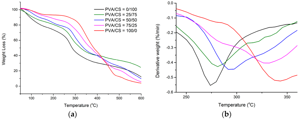 (a) TGA and (b) DTG thermograms of the PVA/CS films with different weight ratios: PVA/CS = 0/100; PVA/CS = 25/75; PVA/CS = 50/50; PVA/CS = 75/25; and PVA/CS = 100/0.