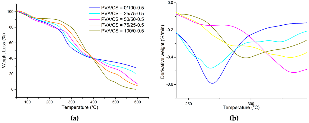 (a) TGA and (b) DTG thermograms of the PVA/CS films with different weight ratios: PVA/CS = 0/100; PVA/CS = 25/75; PVA/CS = 50/50; PVA/CS = 75/25; and PVA/CS = 100/0 at 0.5 wt % of TOCN content.