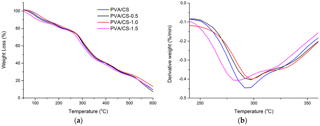 Figure 3a,b shows the TGA and DTG curves of PVA/CS blended films with different weight compositions. Table 1 gives the summary for Figure 3 in thermal parameters including Tonset and Tmax. It was investigated that the first weight loss appeared at about 100 °C due to the evaporation of absorbed water moisture and residual acetic acid [37]. PVA/CS = 0/100 film showed the highest weight loss, which is around 11.68%. Meanwhile, PVA/CS = 100/0 film showed the lowest loss in weight, which is only about 1.15%. Thus, it was suggested that their water-holding capacity are different in such a way that PVA/CS = 0/100 has the highest bound water content while PVA/CS = 100/0 has the lowest bound water content [38]. At 200–300 °C, a major weight loss in the bio-nanocomposite films was attributed to rapid decomposition of polymer segments of PVA and CS due to the thermal scission of the polymer backbone [8,30]. The third weight loss happened at 380–500 °C. This is caused by the degradation of the byproducts generated by PVA during its thermal degradation [8]. Generally, assuming no interaction exists between two polymers—which have different Tonset and, thus, the thermogram of the blends would show its thermal degradation in two different stages. However, from Figure 3, it was observed that each of the PVA/CS films show only one Tonset as shown on their thermograms. This indicates the presence of hydrogen bonding interactions between PVA and CS in each blend [39]. In addition, it can be noted that Tonset and Tmax of the blends change slightly with the different weight composition. However, the Tonset and Tmax of the blends lie between pure CS and pure PVA. These results deduced that these two polymers are well blended together [39]. From the results of the tensile test and TGA, it was observed that the thermal stability of the PVA/CS films increased with the decrease of tensile strength and increased elongation at break. Thus, it can be concluded that the tensile properties are correlated to the thermal stability of the PVA/CS composite films.