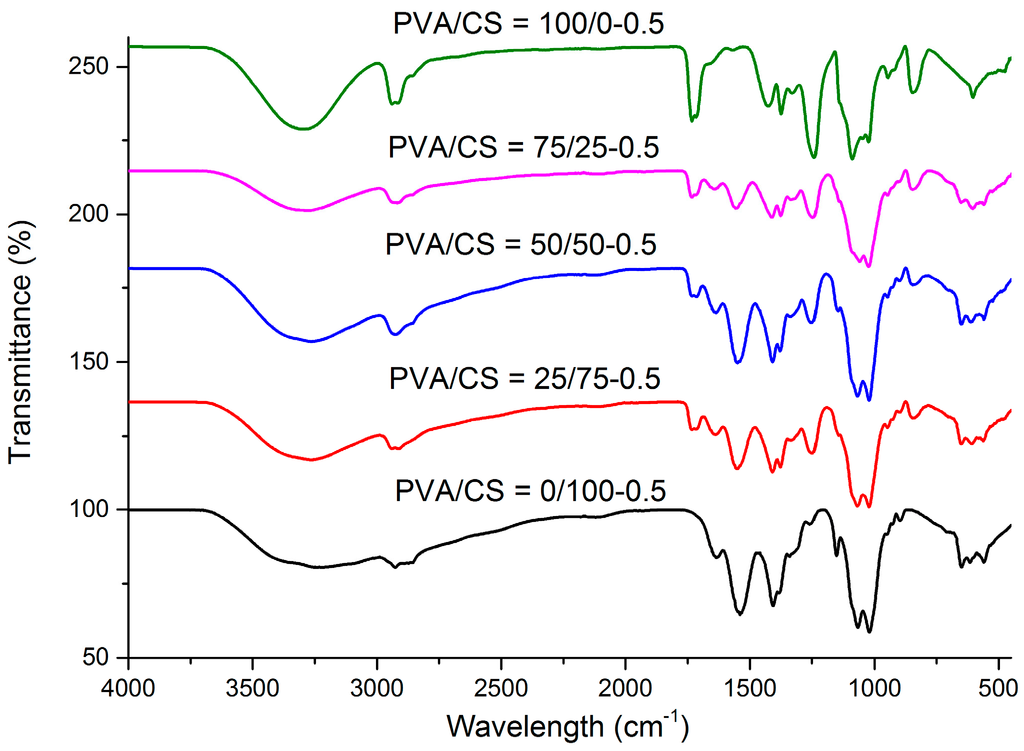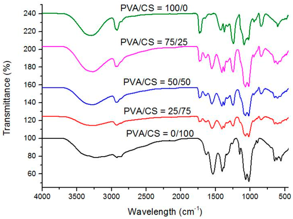 Figure 6 highlights the FTIR spectra of PVA/CS blended films with different weight compositions. From the CS spectrum, the absorption band from 3450–3200 cm−1 is assigned to O–H and N–H stretching vibrations. The band at 2925 cm−1 is associated with C–H stretching. The band at 1633 cm−1 is attributed to C–O stretching of the acetyl group (amide I). The band at 1539 cm−1 is assigned to N–H bending and stretching (amide II) [31]. A weaker amino characteristic peak at 1255 cm−1 is associated with O–H bending vibration and the peak at 1066 cm−1 is assigned to C–O stretching. The absorption band at 1152 cm−1 and 897 cm−1 is assigned to the saccharine structure [42]. For pure PVA, the band at 3301 cm−1 is attributed to –OH stretching vibration; the peak at 1425 cm−1 is assigned to OH bending vibration of the hydroxyl group. The vibrational band at 2925 cm−1 corresponds to asymmetric CH2 group stretching vibration. The peak at about 1633–1561 cm−1 is attributed to the C=C stretching vibration of PVA. The peak corresponding to C–O stretching occurs at approximately 1089 cm−1 while the band at 842 cm−1 is attributed to the C–C stretching vibration [8,41].