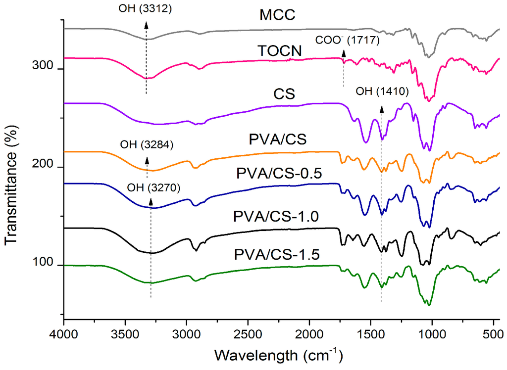 FTIR spectra of the MCC, TOCN, CS, PVA/CS = 50/50 films with TOCN content of 0 wt %; 0.5 wt %; 1.0 wt %; and 1.5 wt %.