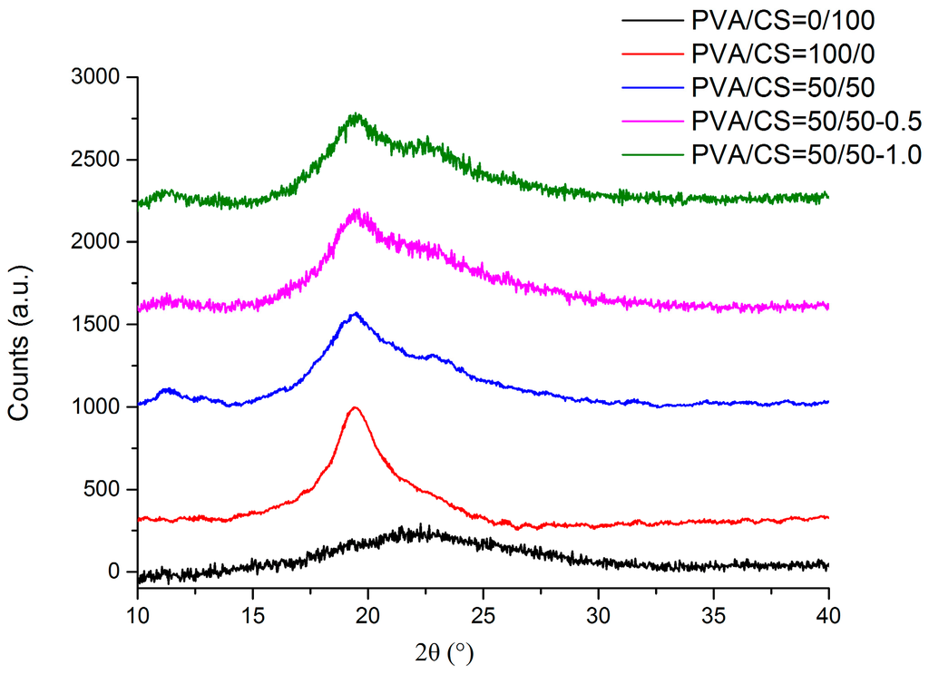 Figure 9 shows the XRD patterns of the pure CS, pure PVA, PVA/CS = 50/50, and PVA/CS = 50/50 films with 0.5 wt % and 1.0 wt % of the TOCN content. For pure CS film, the diffractogram showed three typical peaks with lower intensity at around 2θ = 11.1°, 2θ = 15.1°, and another broad peak centered at 2θ = 21.5° [44]. The peak at 2θ = 11.1° attributed to a hydrated crystalline structure and the broad peak indicated a predominant amorphous structure of CS respectively [45]. Thus, the high amorphous nature of CS film can be deduced through the broadening of the peaks [46]. For the pure PVA film, there were two peaks around 2θ = 11.0° and 2θ = 19.5° [47]. In general, if there is no interaction between two polymer components, each component would have its own crystal region in the composite. Thus, it can be deduced that the XRD patterns would be expressed as simply mixed patterns of different components in the mechanical blending case [48].