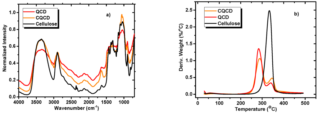 The thermal stability of native cellulose and the hydrogels are inferred from the DTG plot of derivative weight (%/°C) vs. temperature (°C) in Figure 1b. The thermogravimetric analysis (TGA) results show a single thermal event for cellulose relative to two thermal events for the hydrogels, in agreement with an independent report [32]. The maximum decomposition temperature for pristine cellulose occurs at ~320 °C; whereas, the hydrogels display maximum decomposition at ~260 °C and ~360 °C. The two thermal events for the hydrogels differ compared to cellulose, where a single thermal event is shown. The TGA results of the hydrogels relate to cross-linking and/or quaternization of cellulose, in agreement with the FTIR band at 1485 cm−1 in Figure 1a. The lower temperature event (~260 °C) for the hydrogels correspond to the cross-linker and quaternary ammonium groups; whereas, the event at ~360 °C relates to the decomposition of cellulose [32]. The DTG profiles also reveal that the intensity of the thermal event due to the decomposition of the cross-linker and quaternary ammonium groups of the hydrogel differ from the profile of cellulose. The foregoing provides support that cellulose is modified via cross-linking and quaternization. The profile also reveals that the cross-linked and quaternized hydrogel (CQC) has greater thermal stability over the quaternized hydrogel (QC). This greater stability of the cross-linked and quaternized hydrogel may relate to cross-linking effects, as noted for cellulose in another study [12].