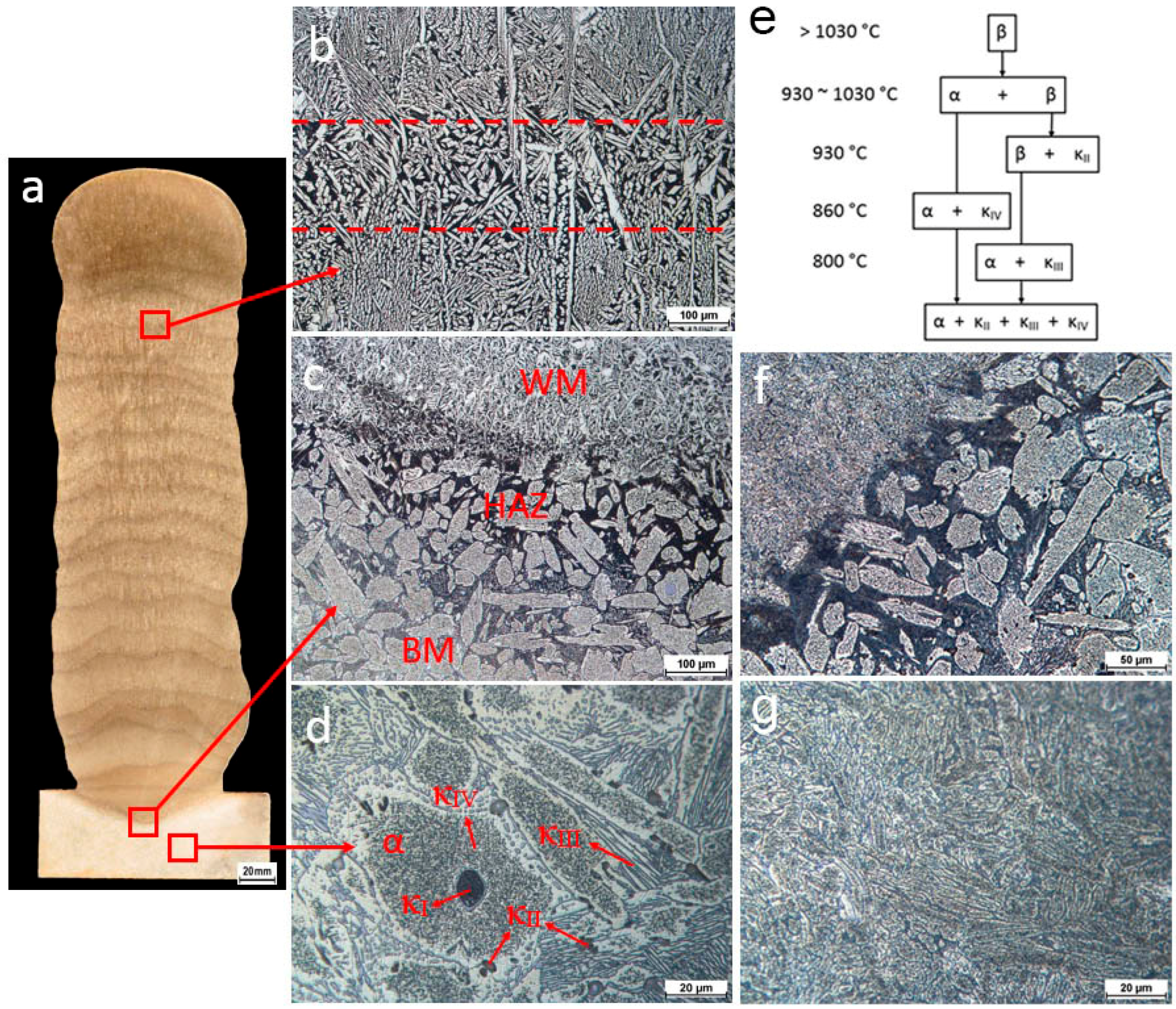 Figure 5f. The HAZ retained large sections of α phase, however, closer to the fusion line appeared partially decomposed. Additionally, the martensite was replaced with a fine grain α phase and κ precipitates. WM has a structure with Widmanstätten α and a small amount of martensite, whilst the PWHT decomposed these leaving a fine homogenized microstructure of α phase and κ precipitates as shown in