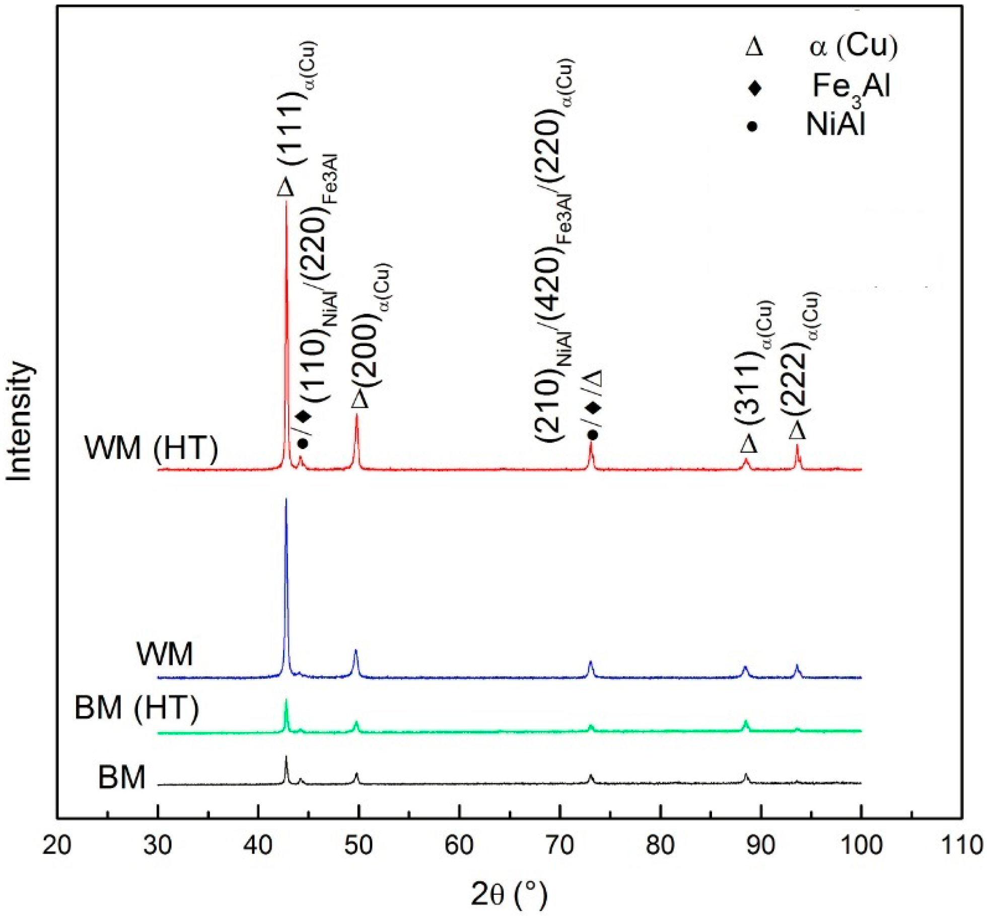 Figure 6. All the diffraction patterns are found to contain a prominence of α(Cu) phase and a certain amount of NiAl or Fe