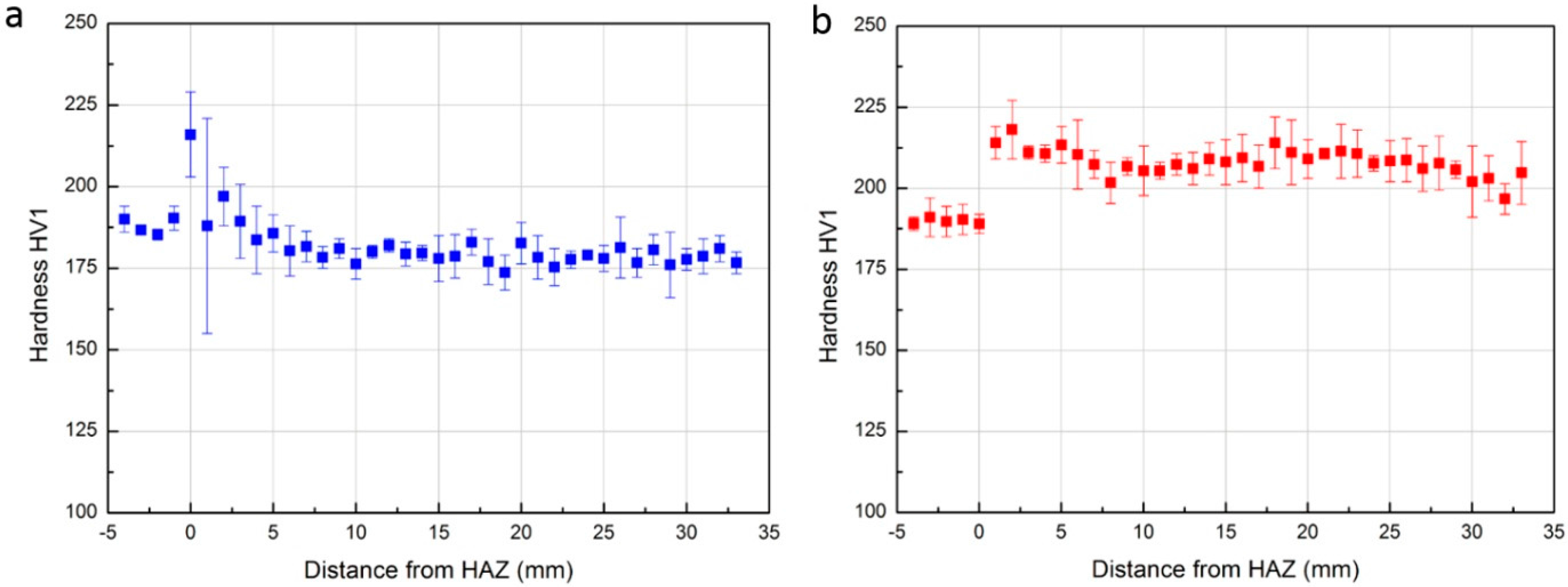 Figure 7a. The BM (distance from −5 to 0 mm) showed little variation in readings with the mean value of 188 HV1. This is expected due to the uniform microstructure of the BM. The HAZ (at 0 mm) in samples showed higher values of hardness due to the formation of martensite. Large variations were observed as there exist partially-transformed martensitic products and the width of HAZ is generally slightly larger than the diagonal of indention left by Vickers Hardness Test. It should be noted that the largest variations of hardness were shown in the region of the first deposited layer (at distance approximately 1 mm) as the microstructure in this region underwent significant change due to the different heat input and cooling rate. The remainder region of as-deposited WM (distance >2 mm) shows very uniform hardness (averaged to 181 HV1) which is also comparable to the BM. With PWHT, as shown in