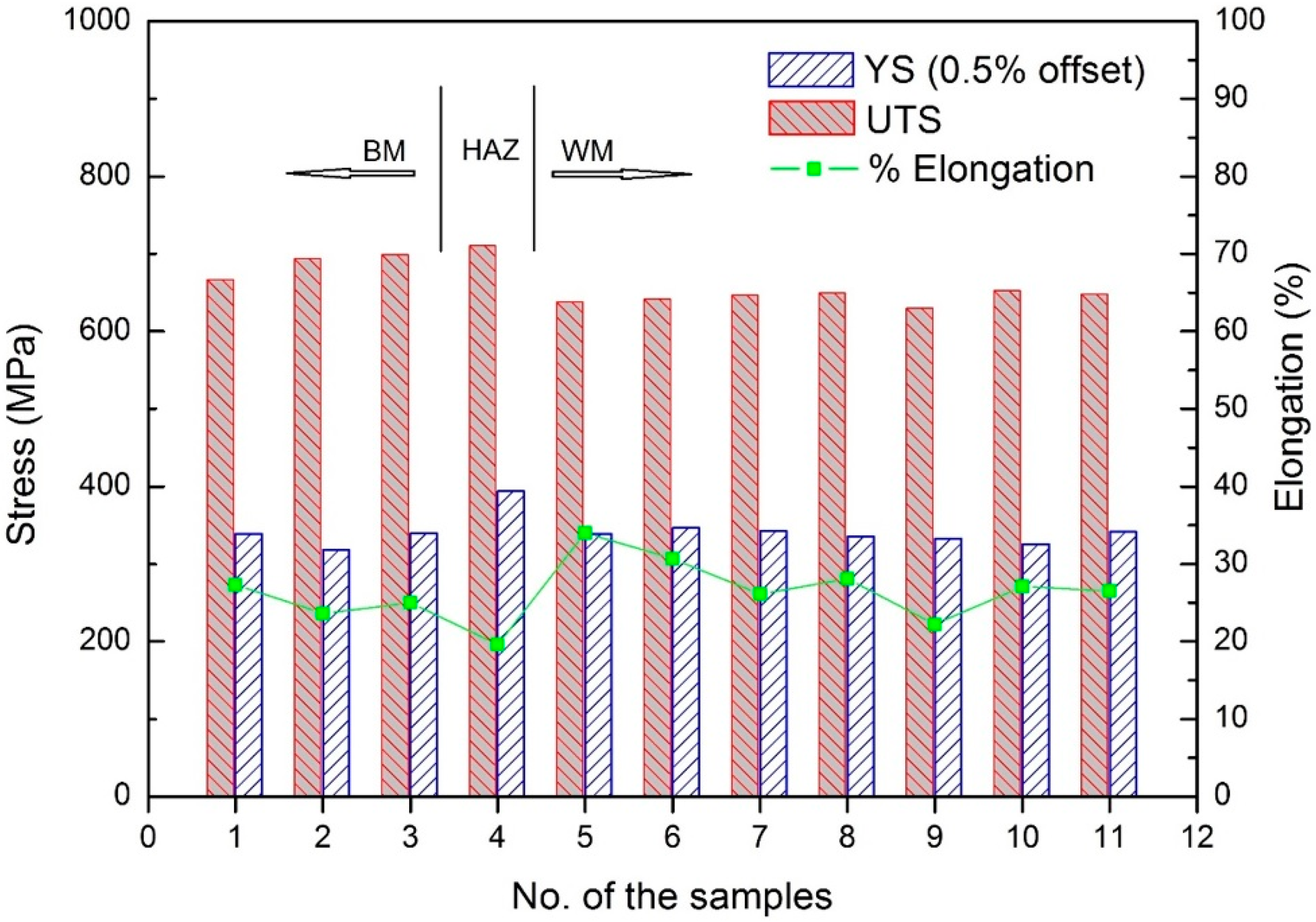 Figure 9 shows the mechanical properties of samples taken from one of the as-deposited walls at different vertical locations. As expected, the BM has uniform mechanical properties with the average values of YS, UTS, and elongation being 332 MPa, 689 MPa, and 25.3%, respectively. In the HAZ, the higher YS of 394 MPa and higher UTS of 711 MPa, while a lower elongation of 19.6% was found, which is predictable. The values of UTS and YS in the WM span 339–342 MPa and 630–653 MPa, respectively. There is no significant variation (less than 3.6%) in tensile strength and yield strength in WM which is plausible. The average elongation in WM is 27.8%. The microstructure in the HAZ is predominantly partially transformed eutectoid structure, in particular, in the area close to the fusion line. The heat input is high enough to raise the temperature above the eutectic point, and therefore forming the β phase. This was retained with rapid cooling, resulting in a martensitic structure that is harder than the α phase, but also less ductile and more brittle. The mechanical properties across the weld metal are expected to be reasonably consistent. From the above data analysis, it is revealed that the mechanical properties of as-deposited WM are comparable to those of as-cast BM.
