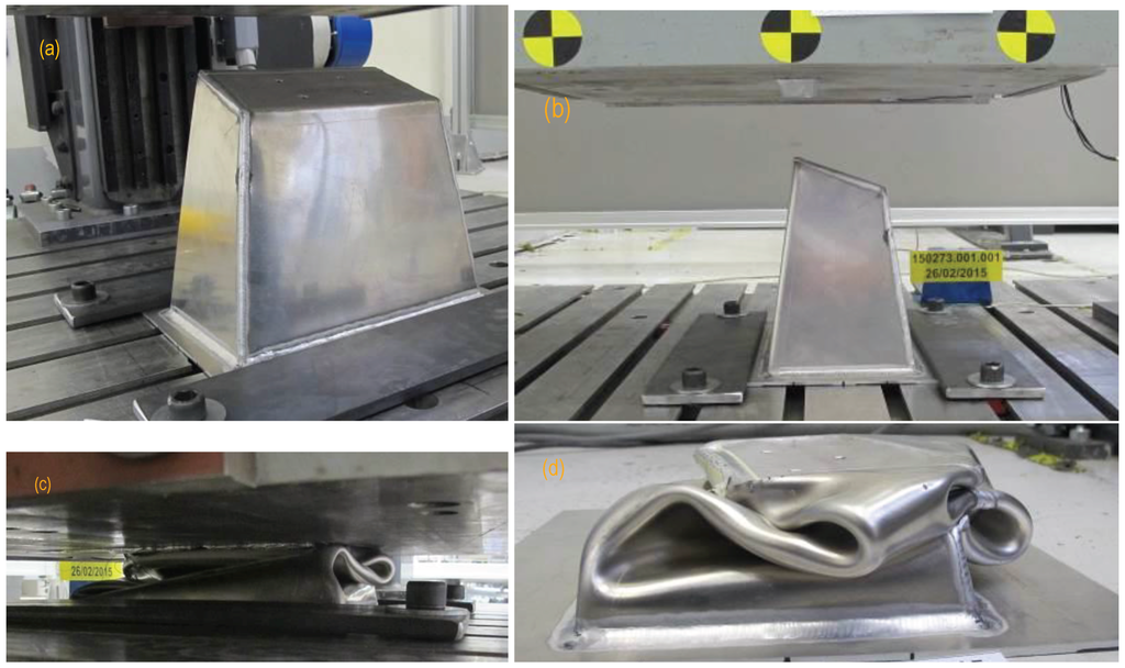 Observation of the images taken during the drop test reveals that 17 ms after the contact there was a failure of the welding at one vertical edge of the IA. This failure is expected to produce decreased rigidity in the prototype compared to the original IA design. At the end of the test, the IA was crushed to a height about 60 mm (see Figure 2c,d).