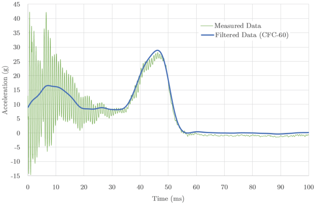 The test report included information about the velocity, acceleration, displacement and energy absorption during the elapsed time of the axial crushing. Figure 3 shows the acceleration measured both as raw and filtered data. The filtered data show an average acceleration of 9.96 g, and a peak value of 28.8 g at 46 ms, corresponding to and , respectively, of the maximum allowed values.