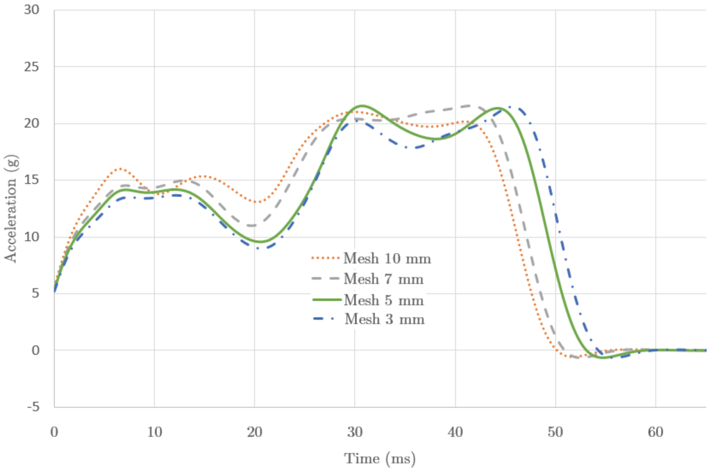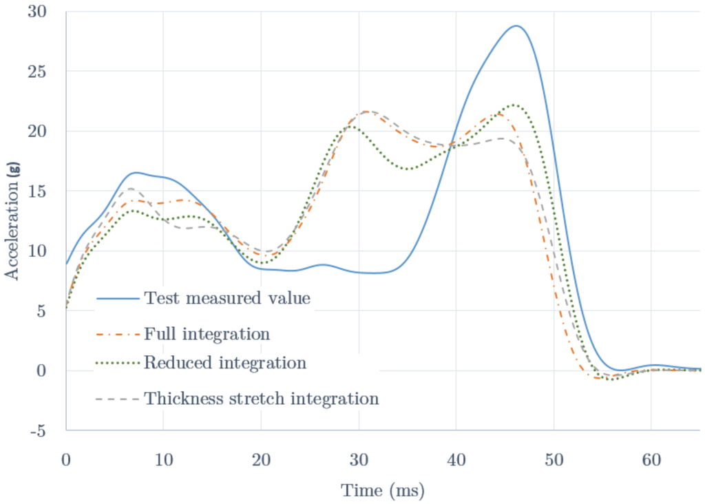 For comparison, the different methods gave peak acceleration values of 22.2 g (reduced integration), 21.6 g (full integration) and 21.6 g (thickness-stretch integration). The average accelerations were 13.8, 14.3 and 14.2 g respectively. The selected method gives the (slightly) greater acceleration peak, but also the lowest mean acceleration value.