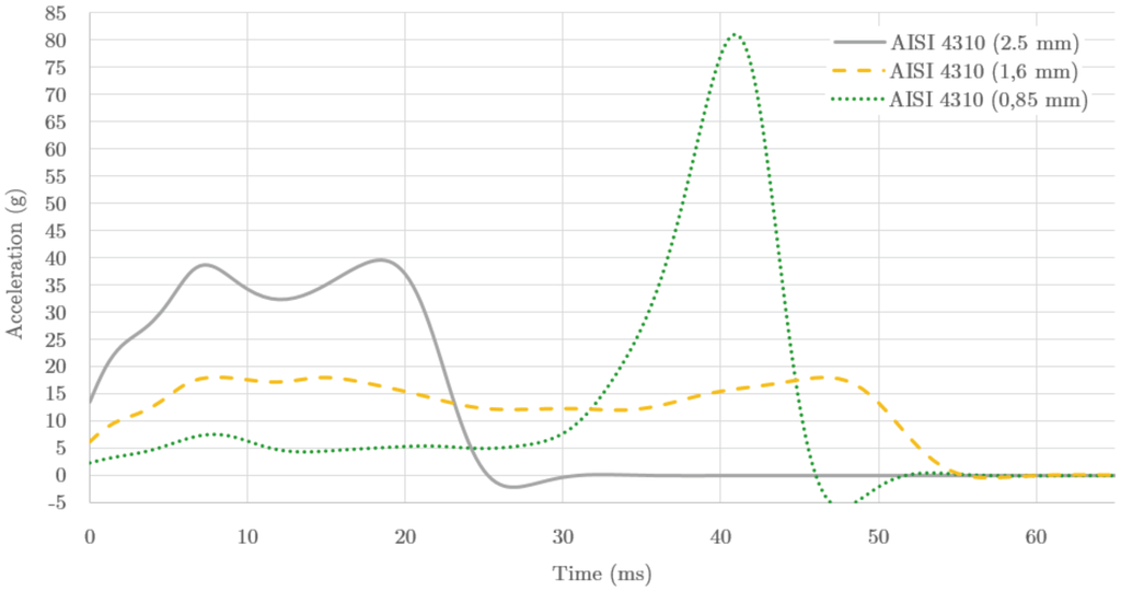 We studied different cases, whose results for the acceleration are plotted in Figure 7. The 2.5 mm thickness, like the aluminium structure with a total weight of 3.46 kg, induces large acceleration values in the initial 20 ms (solid line), reaching values close to the safety limits (40 g for Formula SAE). A thickness of 0.85 mm, a structure with a weight similar to that of aluminium (1.2 kg), has low rigidity and induces a low acceleration until crushing completely the plies and causes a large peak (dotted line), with a factor 2 out of the safety limits. A 1.6 mm thick plate (dashed line) shows a rather flat pattern below 20 g, with average of 13.8 g and a maximum peak of 17.9 g, and is within the rules. The weight of this IA is 2.3 kg, almost double of that of an aluminium one.