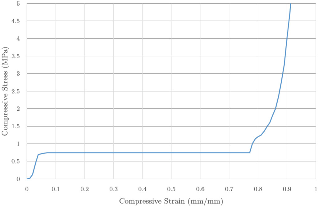 Values of stress (MPa) as function of the strain for a compressive test of IMPAXX500™ material, as given by the producer. The properties of the foam were defined as a crushable Ls-Dyna foam type, and the measured data were input into the model.