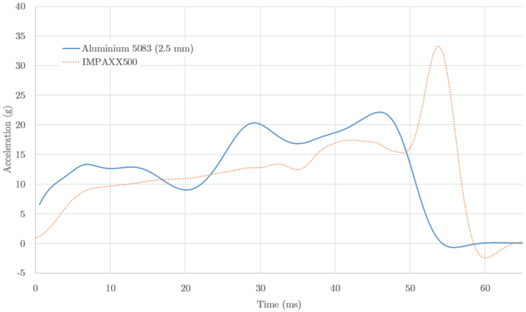 Results of the finite element (FE) analysis for the case materials. Acceleration (g) as a function of the time (ms) during the impact. The data corresponds to aluminium 5083-O (solid line) and the thermoplastic foam IMPAX500 (dotted line).