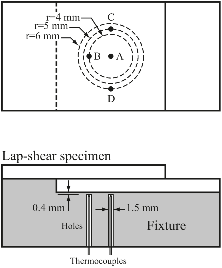 Three weld tools T1, T2, and T3 for weld radii of 4, 5, and 6 mm were used (Table 1). Figure 3 illustrates that the three weld tools have flat shoulders and threaded probes. Metric threads (M3, M4, and M5) with 60° thread angle were applied to the probes of the three weld tools. Notably, these threads were slightly modified to conform to their probe radii. The welding temperatures were measured by 0.08 mm diameter K-type thermocouples at locations A, B, C, and D in the fixture (Figure 4). The thermocouple has measurement accuracy of 0.1 Celsius degree and response time of 0.1 s. The tips of the thermocouples were installed 0.4 mm below the lap-shear specimen. Figure 4 shows location A is below the center of the nugget and locations B, C, and D are below the outer circumferences of T1, T2, and T3 tools, respectively. In Figure 3 and Figure 4, the three weld tools and fixture (anvil) were made of high speed steel SKD 11 and then heat treated.