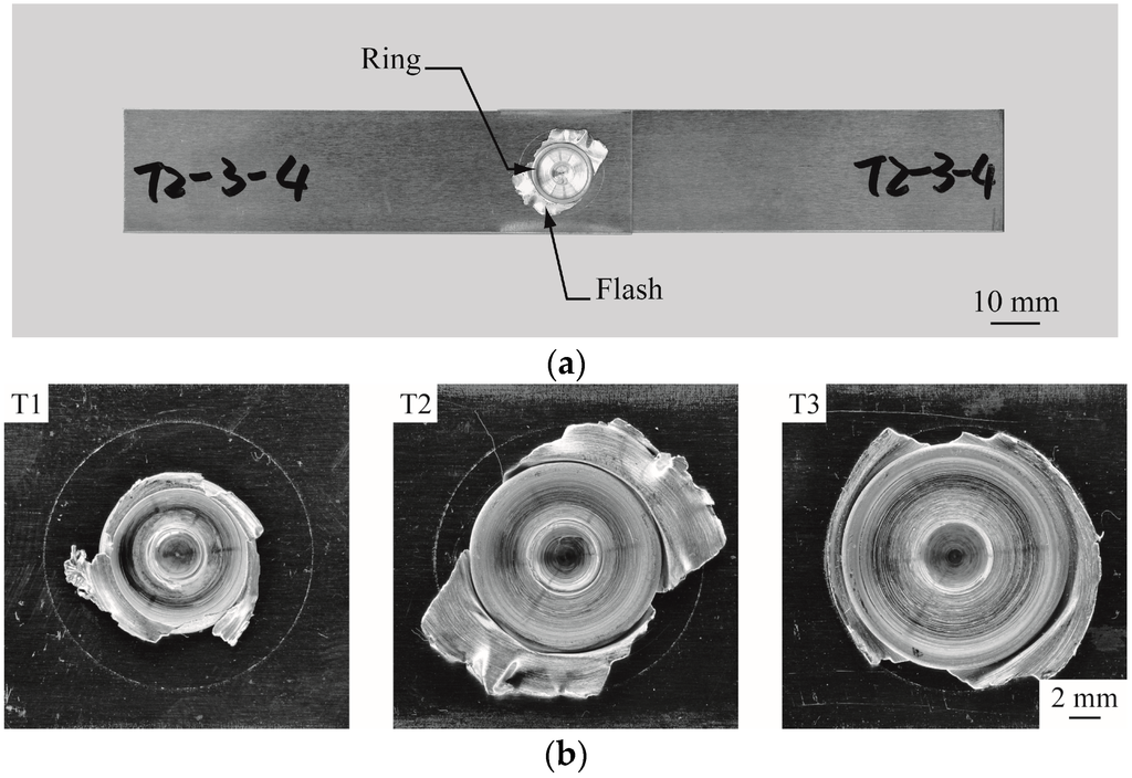 (a) A lap-shear specimen with a 6061-T6 FSSW made by T2 tool; (b) close-up top views of FSSWs made by T1, T2 and T3 tools, respectively.