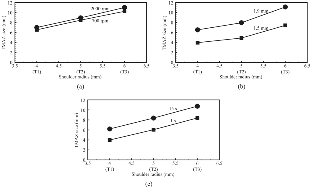 TMAZ sizes of FSSWs made by the three weld tools at (a) rotational speeds of 700 and 2000 rpm; (b) indentation depths of 1.5 and 1.9 mm; and (c) dwelling times of 1 and 15 s.
