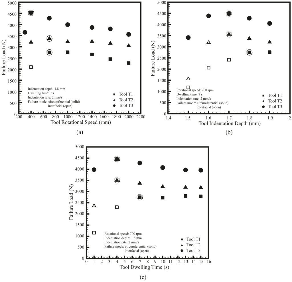 Average failure loads as functions of (a) rotational speed; (b) indentation depth; and (c) dwelling time for FSSWs made by the three weld tools under lap-shear loading conditions.