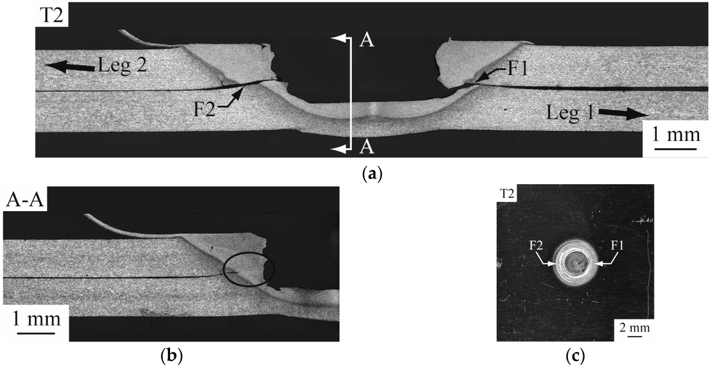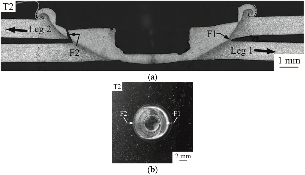 Figure 9 shows partially failed and failed FSSWs observed in the circumferential failure mode. As shown in Figure 9a, a crack, marked as F2, appears to emanate near the left original crack tip of the weld and then propagate along the nugget circumference. Notably, F2 is located near the boundary of TMAZ. It is interesting that Tozaki et al. [2,10] showed the FSSWs failed in similar failure mode have different failure process. The crack grows along the hook curve to the hook tip and then propagates through the upper surface. When the load continues to increase, the upper sheet is torn off with a portion of the nugget at F1, as shown in Figure 9b. The experimental observations suggest that crack F2 appears to be the dominant crack that causes the failure of the specimen.
