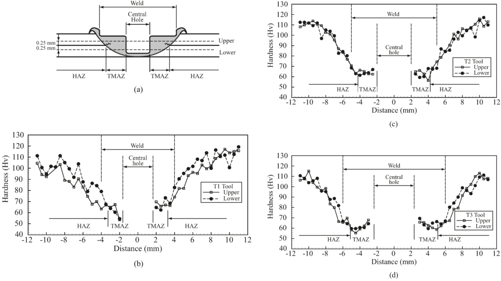 (a) A schematic plot of two horizontal lines for micro-indentations on the cross section of a FSSW; (b–d) Micro-hardness distributions for FSSWs made by T1, T2 and T3 tools, respectively.