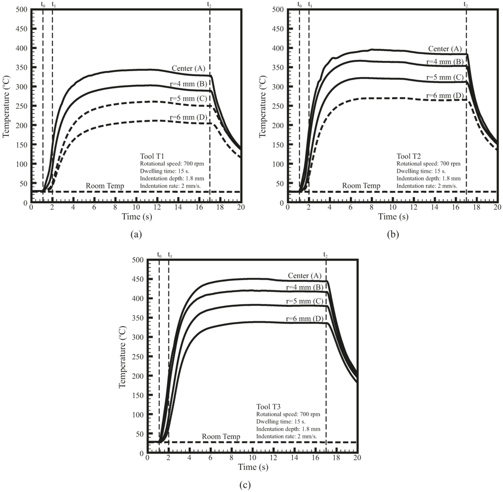 After comparing weld quality, the performances of the three weld tools were further evaluated by temperature during FSSW. Figure 12 shows the temperatures as functions of time at locations A, B, C, and D (Figure 4) for welds made by the three weld tools. The represents the time when the weld tool initially contacted the specimen, represents the time when the weld tool was indented to a depth of 1.8 mm, and represents the time when the weld tool was extracted from the specimen. The thick dashed lines represent the temperatures measured outside the tool shoulder. As shown in Figure 12, the temperature histories for the three weld tools are quite similar. When the probe is indented into the specimen (from to ), the temperature below the nugget at location A rises rapidly. The temperatures below the nugget at locations B, C, and D then rise rapidly as the tool shoulder is gradually indented into the specimen. Shortly after the weld tool is indented to a depth of 1.8 mm, the temperatures at locations A, B, C, and D gradually increase to the maximum values and then slightly decrease. The temperatures finally tend to stabilize until the weld tool is extracted from the specimen. Notably, the temperature data shown in Figure 12 exhibit similar trends as those observed at the contact surface between the tool and weld in Gerlich et al. [12].