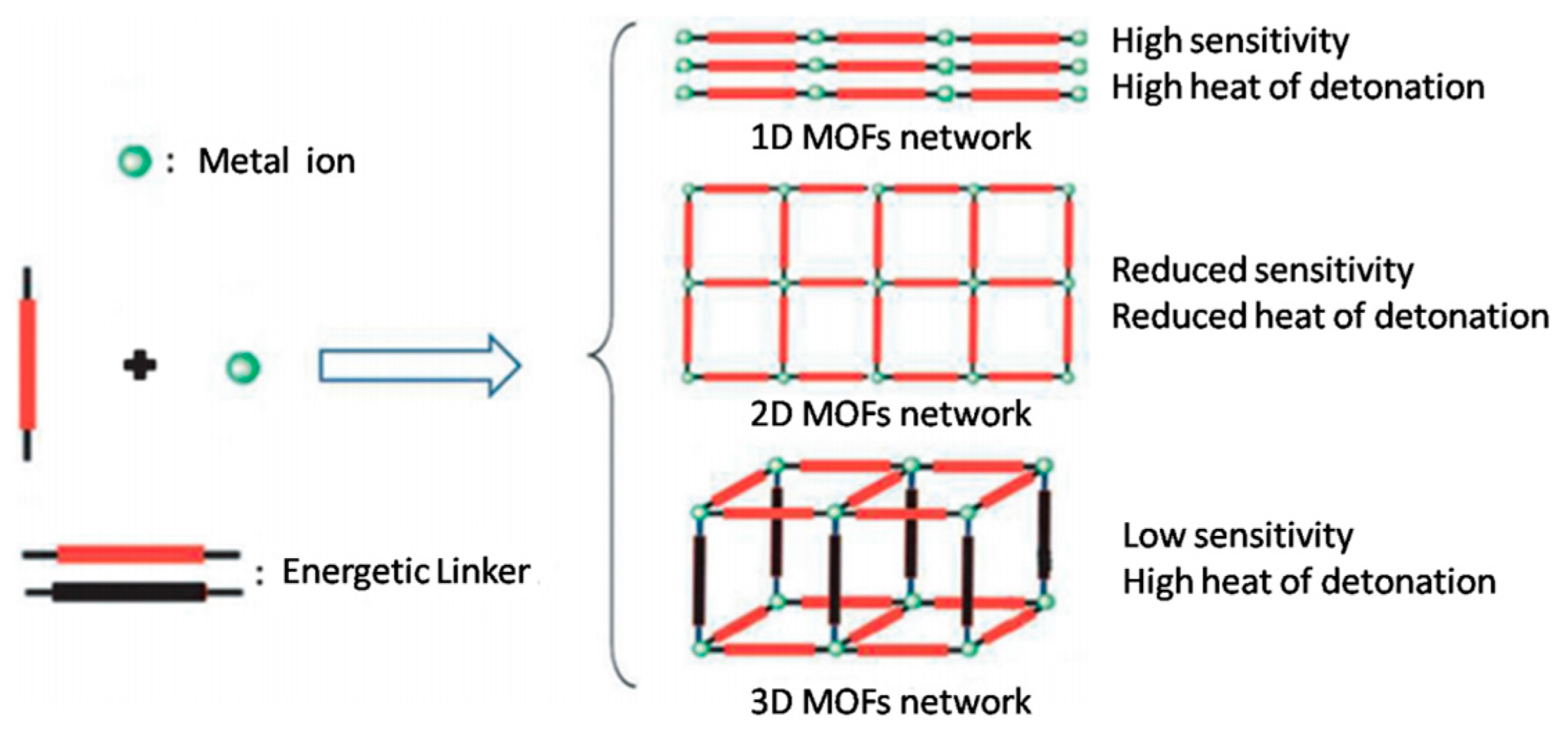 In the past decade, metal-organic frameworks (MOFs) have elicited much interest in chemistry, material science, medicine, and environmental science [1,2,3,4,5,6,7,8,9] because of their stable architectures, controllable structures, modifiable properties, and potential applications in gas storage [10,11,12,13], chemical separation [14,15,16,17], catalysis [18,19,20,21], chemical sensor technology [5], drug delivery [22,23,24], and so on. Many investigators have recently demonstrated the possibility of using nitrogen-rich MOFs as high explosives [25,26,27,28,29,30,31,32,33,34,35,36,37,38,39,40,41,42,43,44,45,46,47,48]. MOFs consist of metal ions (Pb2+, Ag+, etc.), energetic anions (e.g., N3− and NO3−), or simple energetic ligands (triazole, tetrazole, tetrazine, hydrazine, etc.). The network structures of energetic MOFs (E-MOFs) can be designed as 1D, 2D, or 3D architectures (Figure 1) depending on the metal ion geometry and binding mode of the bridging energetic ligands.