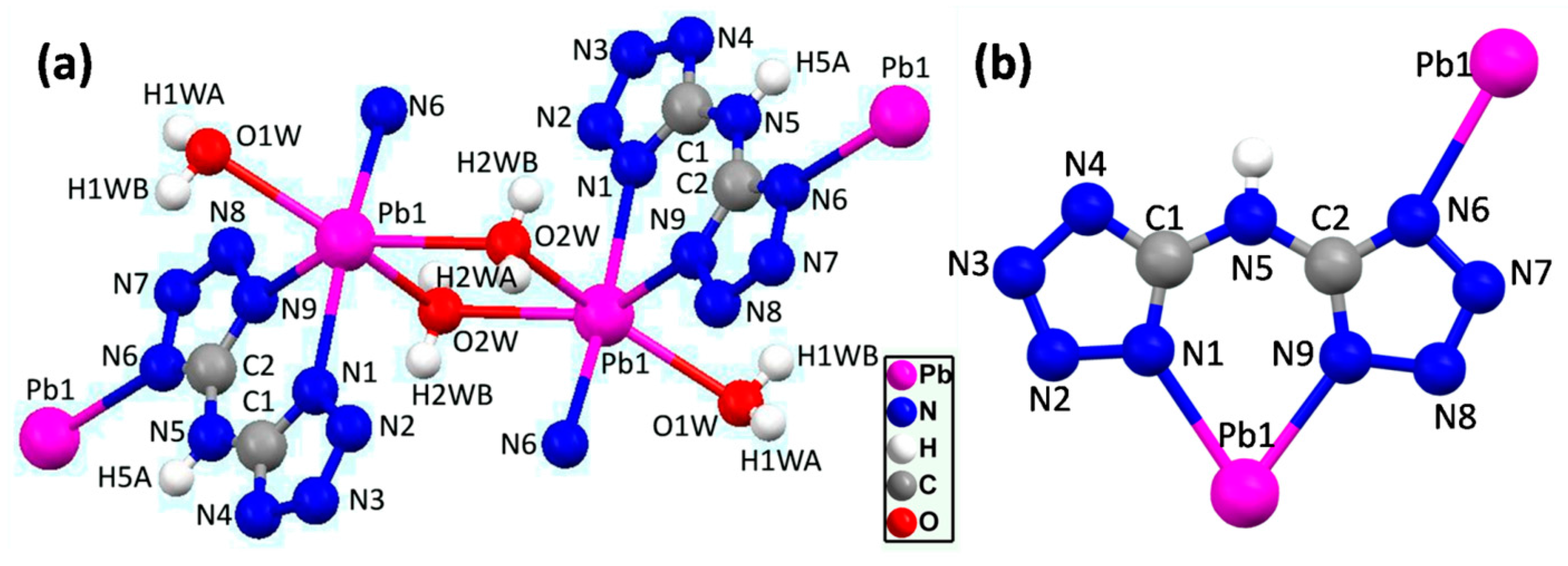 The asymmetric unit is crystallographically independent with one Pb(II) ion, one bta2− ligand, and two coordination water molecules (Figure 3a). Figure 3a shows that each Pb(II) ion is coordinated by three nitrogen atoms from two bta2− ligands and three oxygen atoms from water molecules. Anirregular octahedral geometry is exhibited. Compared with the structure of H2bta [58], all of the bond lengths and angles are slightly changed, which may be caused by the negative charge on the anion rings and thecoordination environment. The C–N bond lengths of C1–N1 [1.322(9) Å], C1–N4 [1.322(9) Å], C1–N5 [1.379(9) Å], C2–N5 [1.377(8) Å], C2–N6 [1.330(8) Å], and C2–N9 [1.328(8) Å] are between the standard C–N single bond (1.47 Å) and standard C=N double bond (1.32 Å) lengths and are indicative of an aromatic system [72,73]. Meanwhile, the N–N bond lengths of N1–N2 [1.376(7) Å], N2–N3 [1.284(9) Å], N3–N4 [1.350(8) Å], N6–N7 [1.347(9) Å], N7–N8 [1.306(8) Å], and N8–N9 [1.369(8) Å] also fit between the standard N–N single bond (1.45 Å) and standard N=N double bond (1.25 Å) lengths [74,75], which further confirmstheconjugated and aromatic system. In addition, the bond angles C2–N5–C1 [125.0(6)°], N4–C1–N5 [112.8(6)°], N5–C2–N9 [127.2(6)°], and N6–C2–N9 [111.9(6)°] are slightly larger than thoseof H2bta because of the influence of the coordination environment. Figure 3b shows that the coordination mode of the ligand has three coordinated nitrogen atoms (N1, N9, and N6) in each bta2−. Atoms N1 and N9 in the ligand adopt chelating modes to connect to Pb(II) ion, whereas atom N6 adopts monodentate bridging modes to link with other Pb(II) ions.