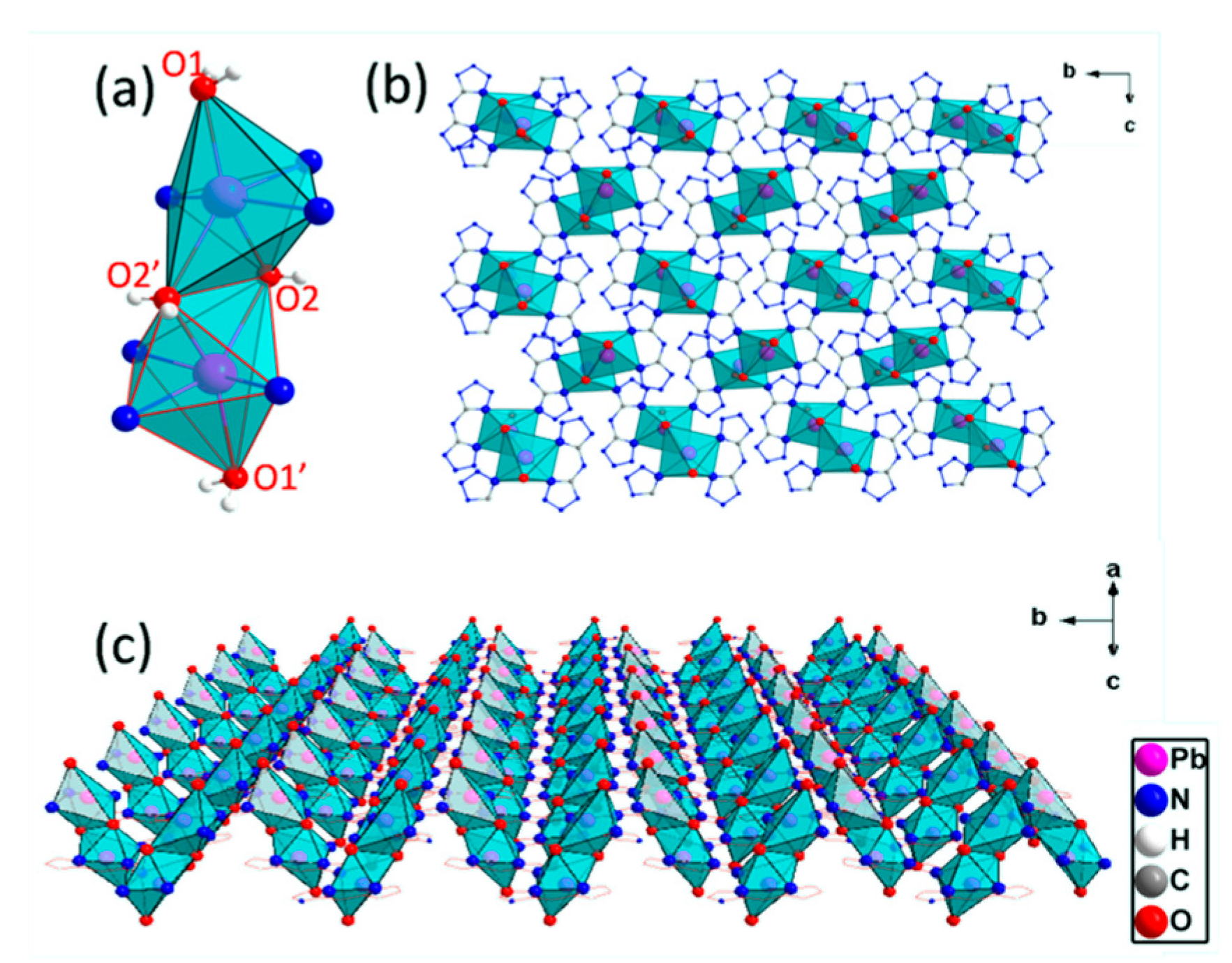 Coordination polyhedron geometry of [Pb(bta)·2H2O]n (a) polyhedrons with Pb(II) as the center viewed down a-axis (b) and the a–c diagonal (c).