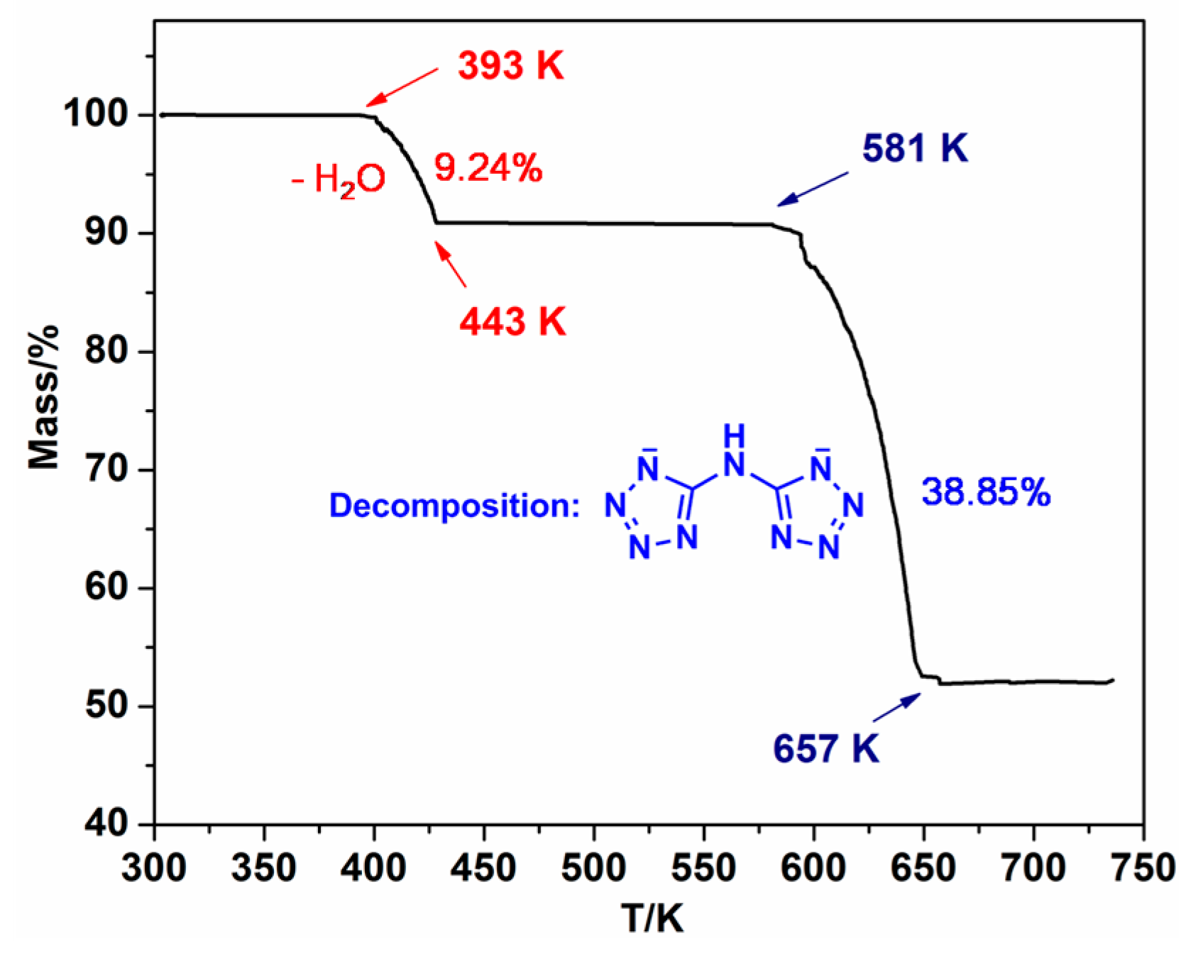 The decomposition process of the complex was also investigated through the rmogravimetric analysis (TGA) at a heating rate of 5 K·min−1 in nitrogen atmosphere. Figure 7 shows that the decomposition process of the complex can be divided into two steps, and the total mass loss is 48.09%. The first process in the range of 393 K–443 K was confirmed as the loss of crystal water (observed 9.24%, calculated 9.13%). This result indicates that the water molecules in the title complex were stable before 443 K. The second process from 581 to 657 K was considered the collapse of the structures related to the nitrogen-rich bta2− groups.