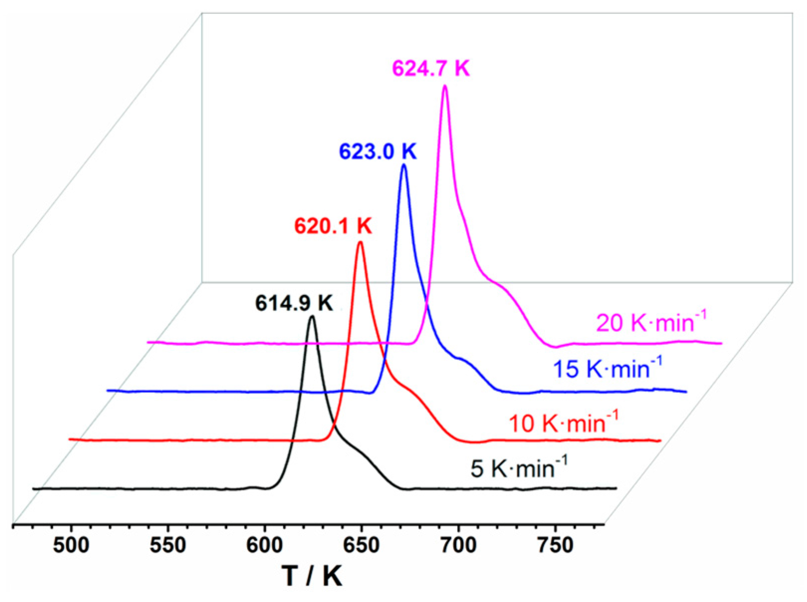 Kissinger’s [77] and Ozawa’s methods [78,79] were used to determine the kinetics parameters based on the exothermic peaks temperature measured from DSC curves with four different heating rates (5, 10, 15, 20 K·min−1; Figure 8).
