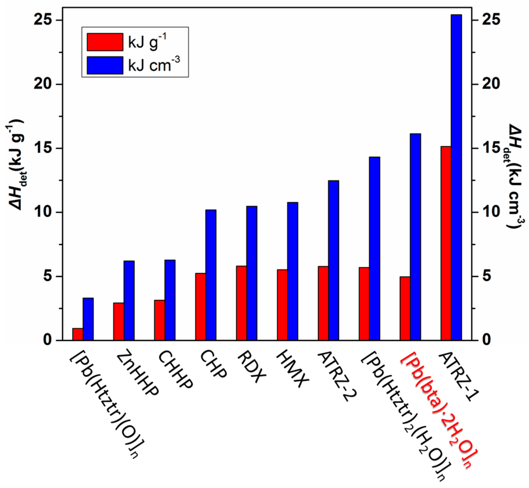 Heat of detonation (∆Hdet) was calculated to be 4.966 kJ·g−1. It is higher than those of MOFs ([Pb(Htztr)(O)]n, 0.94 kJ·g−1; CHHP, 3.14 kJ·g−1; ZnHHP, 2.93 kJ·g−1) but lower than those of RDX (5.799 kJ·g−1) and HMX (5.523 kJ·g−1) (see in Table 3). Figure 9 shows that despite the lack of advantage of the ∆Hdet of the per gram complex, the ∆Hdet of per cm3 (16.142 kJ·cm−3) is higher than that of traditional explosives and E-MOFs, except for ATRZ-1 (ATRZ: 4,4’-azo-1,2,4-triazole) because of its high density.