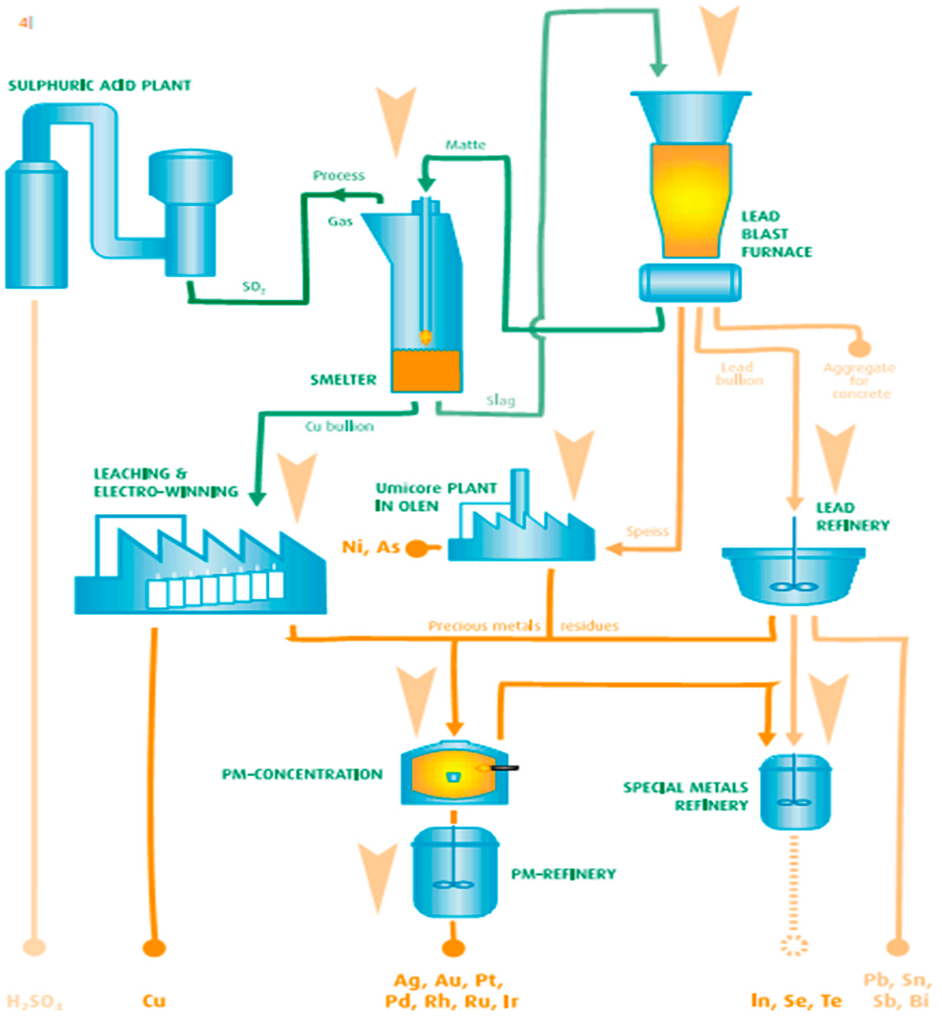 - Hageluken, C. Electronic scrap recycling at Umicore. In Proceedings of the 3rd China International Metal Recycling Forum, Dalian, China, 18–29 March 2007.
