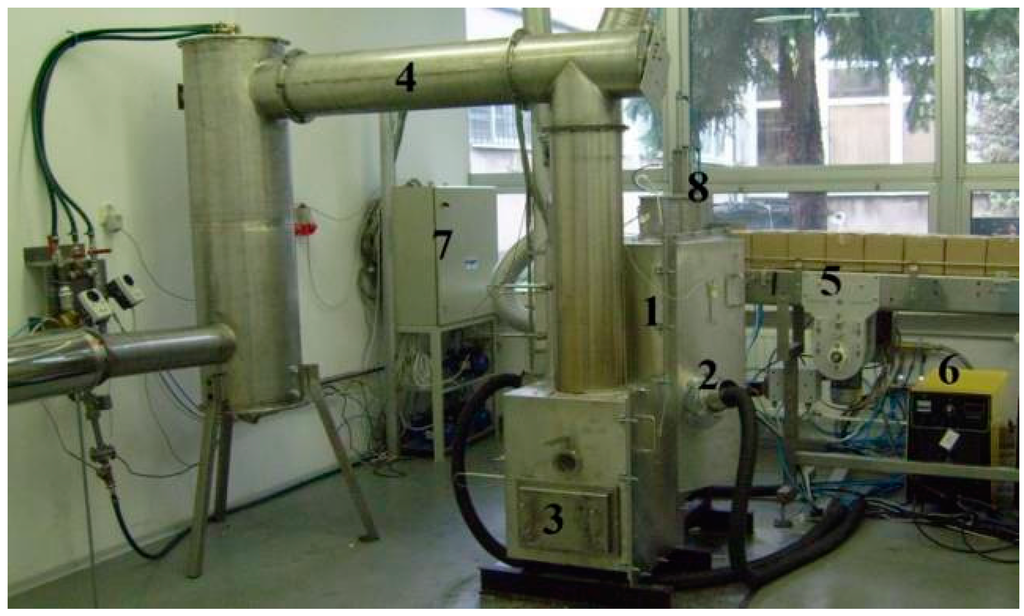 The waste was prepared in the form of boxed portions, allowing its automated feeding into the reactor. Prepared waste portions, on the conveyor, are visible in Figure 2 (marked no. 5).