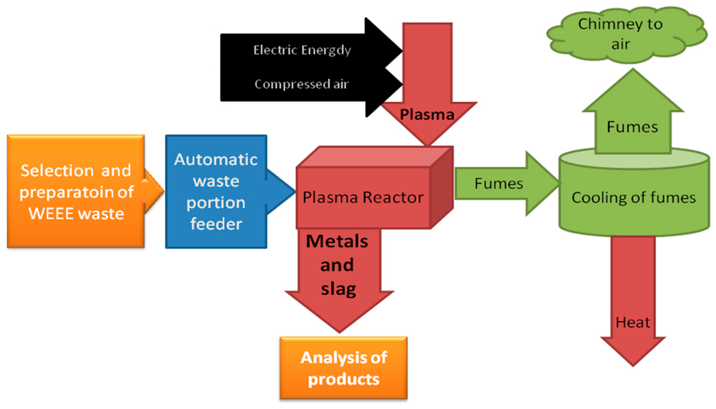 Another way of processing waste of printed circuit boards is through the use of mechanical methods based on fine milling, and multi-step segregation of such powdered materials. Mechanical processing allows recovery of aluminium, copper (heavy category), plastics, ferrous metals, glass, and dusts. A disadvantage of those methods is the loss of precious metals [13] and contamination of recovered materials; the recovered and segregated resources need to be further processed using pyrometallurgical or chemical processes to recover pure metals and remove the contaminants. Mechanical methods are widely used to process WEEE and recover Al, Fe, Cu (brass), plastics, and printed circuit boards. Then, those resources are sold to companies that process and purify them to the form of pure metal products. As for the category of PCB segregated from WEEE, this resource is sold to smelting plants for recovery of metals. As presented in this paper, plasma technology can become an alternative for the centralized smelting technologies described above.