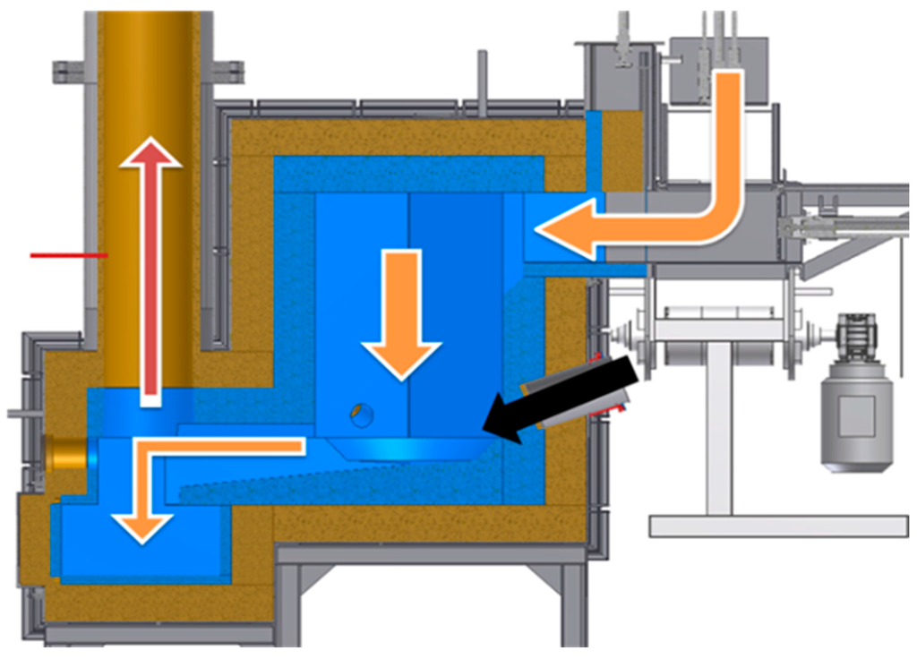 The prepared waste portion is transported through an automatic feeder to the plasma reactor chamber. In the reactor chamber, the waste is incinerated and melted by three plasma streams. Next, the incineration fumes are transported to the scrubber where they are neutralized, cooled, and released to the atmosphere. As for the metals and slag, in the molten form they flow out from the reactor and set in casts, from which they can be recovered and recycled. Figure 4 presents a cross-section of the reactor. Arrows mark the waste and metals route (orange arrow), plasma stream (black arrow), and the direction of fumes exhaust (red arrow). The construction of the test reactor chamber allows immediate slag and molten metal outflow, so they are not retained in the reactor chamber.