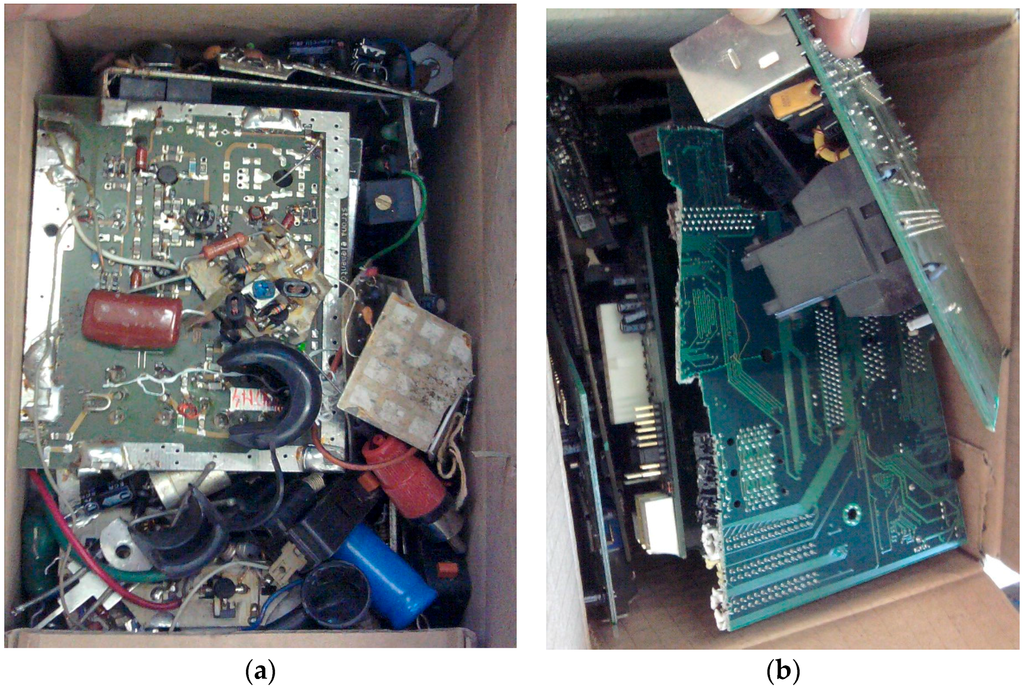In the presented experiments, 36 kg of PCB waste was used in total (Table 3). The experiments were carried out in 2012 on printed circuit boards collected from used PCs and other electronic scrap (Figure 5). In the experiments, two types of PCB waste were used:
